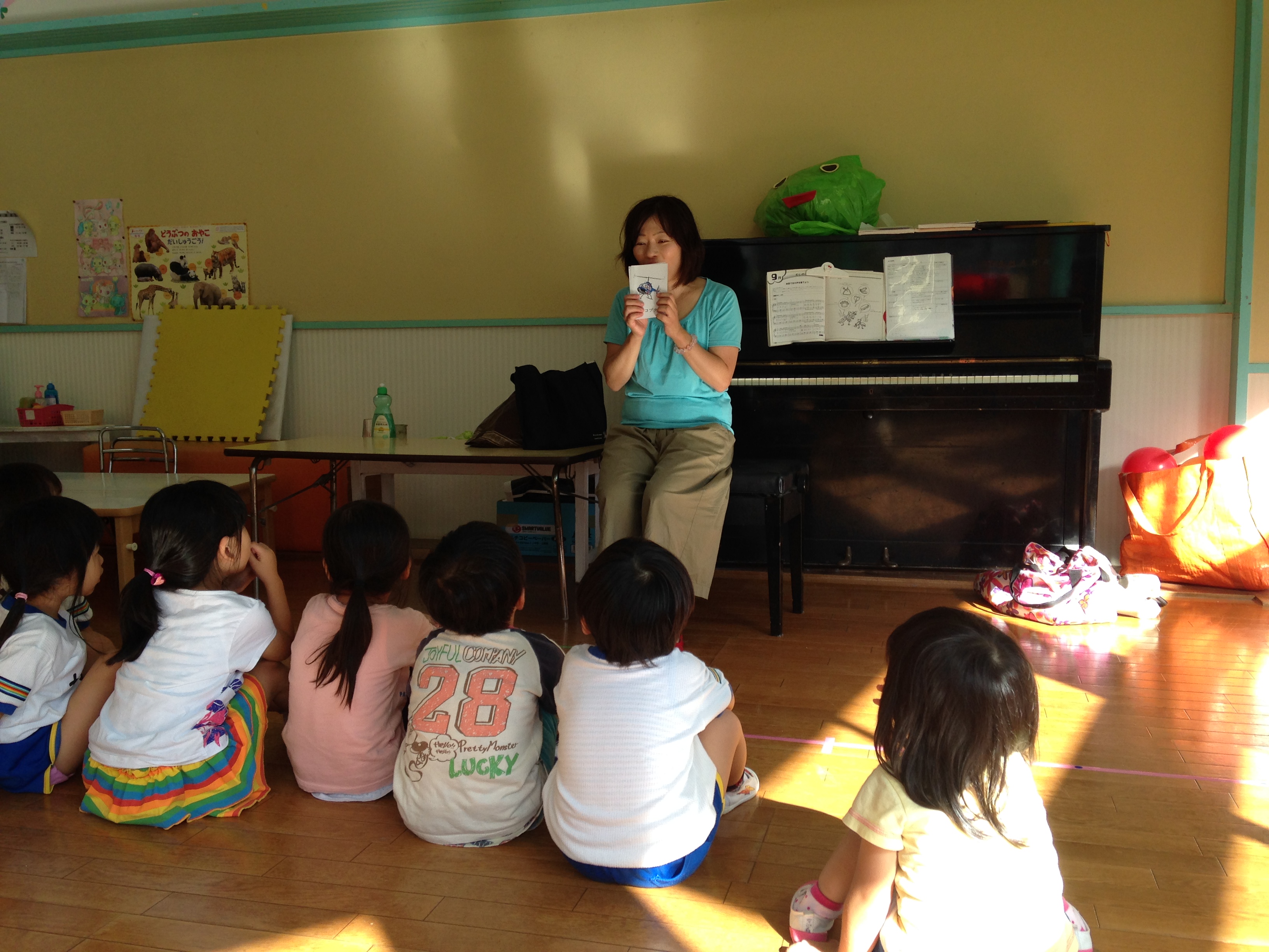 私は、毎週火曜日、音楽教室の担当で、3歳から6歳までの子どもたちに、リトミックや演奏の基礎などを担当させていただいております。