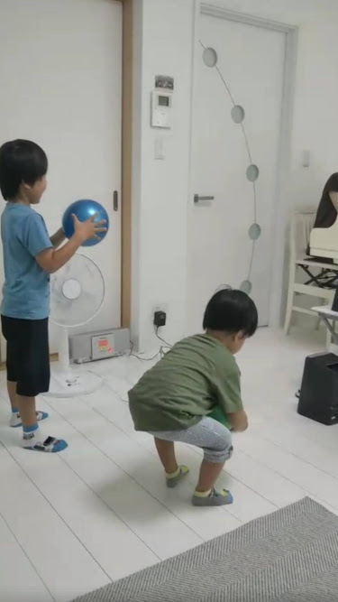 頑張って見学していたので最後のボールのリトミックを一緒にやりました。まずお兄ちゃんが見本を見せて、そして2人で☆彡