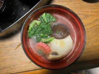 作ったものは黒豆、白豆、煮物、栗きんとん、紅白なます、お雑煮、海老の煮付け、お刺身(夫)、その他は切り分けただけ。